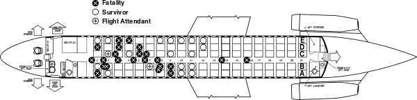 21 pasajeros de nacionalidad canadiense y 2 estadounidenses fallecieron cuando el avión fue consumido por las llamas; la mayoría de los cadáveres quedaron calcinados y las autopsias que se les practicaron revelaron altos niveles de cianuro, fluoruro y monóxido de carbono en sangre, producto del incendio.