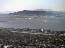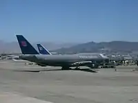 ![]() Varios Boeing 747-400 de United Airlines en el Aeropuerto Internacional de San Francisco; la montaña San Bruno asciende hasta una altura de 1319 pies (402 m) en el fondo, excluyendo las antenas de radio. | ||