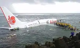 ![]() El Boeing 737 cuando se detuvo después de impactar las aguas poco profundas. | ||