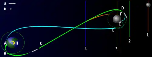 Si se desea realizar un vuelo circunlunar, es decir se aproxime a la Luna, la circunvale y regrese a la Tierra, en necesario proyectar una órbita elíptica con una gran excentricidad que intercepte a la trayectoria de nuestro satélite ligeramente por delante de la misma. Una vez llegado a ese punto, será el campo gravitatorio lunar el encargado de arrastrar al vehículo obligándole a describir una trayectoria curvada y volver de nuevo en dirección a la Tierra.