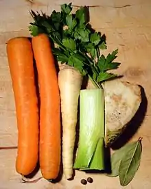 Una włoszczyzna consiste en varias verduras de raíz: zanahorias, pastinacas, raíz de perejil, de apio o apionabo. A veces también verdura de hoja, como puerros, hojas de col blanca o rizada y hojas de apio o perejil. Se vende como combinado en paquetes. La combinación empaquetada más típica consta de raíz de apio, raíz de perejil, zanahoria y puerro. Para hacer el guiso, se suele cortar la verdura en trozos del mismo tamaño y se hierven para emplear el resultado como base de sabor para multitud de sopas y guisos, como la típica sopa polaca krupnik.