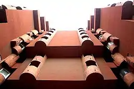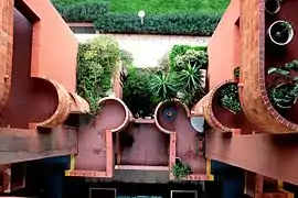 Aunque el exterior del edificio es de un color rojo arcilloso, en el interior se combina este color con un azul intenso. De color azul son por ejemplo las zonas comunes de la planta baja, los pasillos, pasarelas y las paredes de los cuatro principales patios interiores (con una fuente en la planta baja).