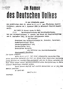 - Günther Vollmer, director ministerial del Ministerio de Justicia del Reich, escribió: «Ya no son tolerables y fundamentalmente dignos de muerte son comentarios [...] del siguiente tipo: la guerra está perdida; Alemania o el Führer lucharon y comenzaron la guerra sin sentido o frívolamente y deben perderla; el NSDAP debería o debe renunciar al poder y, como el modelo italiano, dar paso a la comprensión de la paz; se debe establecer una dictadura militar y poder forjar la paz, uno debe trabajar lentamente para llegar a la conclusión; una intrusión del bolchevismo no sería tan mala como la pinta la propaganda y solo dañará a los principales nacionalsocialistas; los ingleses o los estadounidenses detendrán el bolchevismo en la frontera alemana; instando de boca en boca o con letras al frente para arrojar sus armas o dar la vuelta; el Führer está enfermo, es un incompetente, carnicero, etc.».