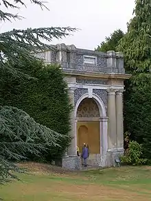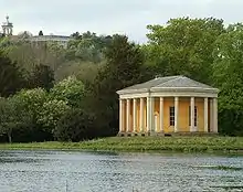 La arquitectura clásica continúa a lo largo del camino alrededor del lago, con el "Templo de Flora", una casa de verano escondida, y el "Templo de Daphne", ambos con reminiscencias de un pequeño templo en la Acrópolis. Otro templo escondido, el "Templo Redondo", tiene una logia curva. Más cerca de la casa, ocultando el ala de servicio, se encuentra un arco de triunfo romano, el "Templo de Apolo ", también conocido (debido a su antiguo uso como lugar para las peleas de gallos) como "Arco de la carlinga", que contiene una copia del el famoso Apolo de Belvedere. Muy cerca se encuentra el "Templo de Diana", con un pequeño nicho que contiene una estatua de la diosa. Otra diosa se celebra en el "Templo de Venus". Debajo hay una Exedra, una gruta (conocida como el Salón de Venus) y una estatua de Mercurio. Esta vez tuvo una copia de la Venus de Medici; fue demolido en la década de 1820 pero reconstruido en la década de 1980 y ahora tiene una réplica de la Venus de Milo.[39]