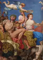 El Salón Azul está dominado por el elaborado techo pintado que representa "El triunfo de Baco y Ariadna" (ilustrada a la izquierda). Esta sala alberga una estatuilla de yeso de la Venus de Medici y marca la atrevida devoción del segundo baronet a esa diosa del amor. La sala tiene paredes de felpa azul, aplicadas en la década de 1850 y posteriormente renovadas, con pinturas de varias escuelas italianas del siglo XVII.[26] El Salón Rojo está forrado en seda carmesí y está amueblado con cómodas de marquetería.[27]