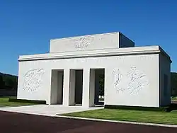 Siguiendo nuestro propósito de poner el arte estadounidense de manera prominente ante el mundo, hace unos años los directores asignaron la suma de 25 000 dólares para la construcción de un edificio de exhibición en Venecia en los terrenos de la Bienal Internacional. Delano y Aldrich donaron generosamente los planos de este edificio que está construido con mármol de Istria y ladrillo rosa y se mantiene a la altura de los otros veinticinco edificios del parque propiedad de varios gobiernos europeos.[8]