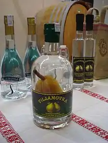 La pera también es muy popular en los Balcanes occidentales, donde se destila en brandy conocido como Viljamovka,[13] similar a "Poire Williams" pero a menudo con un mayor porcentaje de alcohol. Algunos productores de Viljamovka incluyen una pera entera dentro de cada botella. Esto se logra uniendo la botella a una pera en desarrollo en ciernes para que la pera crezca en su interior.