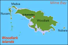 La isla Woodlark, conocida por sus habitantes como Woodlark, Muyuw o Muyua;[1] y Murua por los habitantes de algunas islas vecinas, es una isla papú. Es la isla principal de un pequeño archipiélago que lleva su nombre, junto las islas Madau y Nusam, situadas al oeste, y las islas Nubara y las Marshall Bennett, situadas al este. Originalmente tuvo minas de oro, aunque ahora basa gran parte de su economía en la producción de ébano.[4]