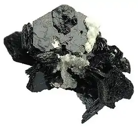 ![]() Ejemplar con placas-cristales hexagonales, muy brillantes, de color marrón rojizo, asociados con calcita blanca (de la mina Yaogangxian, provincia de Hunan; 2.6 x 1.8 x 1.3 cm) | ||