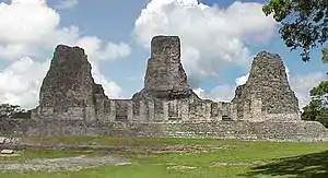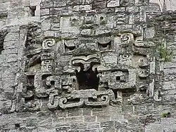 Imagen de detalle de la parte trasera de la torre central de la denominada Estructura I de Xpujil.