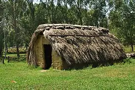 ![]() Reconstrucción de una cabaña según los datos aportados por los estudios del yacimiento. | ||