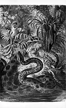 La boa enroscó con la cola a Jenarito y lo levantó hasta el techo de la choza. Pero de pronto, la boa volvió la cabeza hacia la selva, como percibiendo algo. De lejos se podía percibir que las aves volaban y los monos chillaban. Era evidente que algo se acercaba amenazadoramente, y efectivamente, de manera rauda, el tigre de la selva entró de un salto en la choza. La boa, con cuidado, descendió al niño en un rincón de la choza y se preparó para luchar contra el felino.[8]