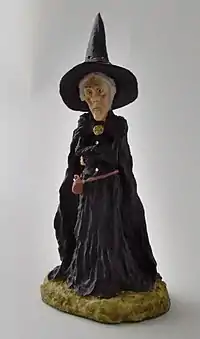 Su aspecto es el de una mujer alta y delgada, con llamativa y afilada nariz aguileña y ojos muy azules (como zafiros) con una tremenda fuerza (física y de voluntad) y una dura actitud increíble (cuando va por un camino las carretas, soldados e incluso animales en estampidas prefieren cederle el paso), siempre viste de negro con la moda de la bruja, es decir vestido o falda negra, capa negra con forro de terciopelo rojo, sombrero negro y puntiagudo y botas gruesas de dura punta cuadrada.