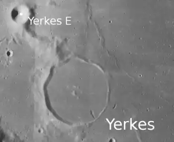 Por convención estos elementos son identificados en los mapas lunares poniendo la letra en el lado del punto medio del cráter que está más cercano a Yerkes. Yerkes E se encuentra a unos 30 km al noroeste y su diámetro es de 10 km.