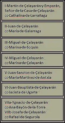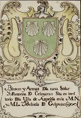 "Don Francisco Joseph de Emparán, como parte del pretendiente en estas pruebas, me puso de manifiesto la genealogía de los Çelayaranes, y de ella consta que Dª. Jossepha de Çelayarán, Abuela lexítima de dho. pretendiente fue hixa lexítima de Don Juan Bauptista de Çelayarán y de Dª. Jacinta de Ugarte,[6] y dho. Don Juan Bauptista hixo lexítimo de Don Juan de Çelayarán y de Dª. María Martínez de Antia, y Nieto lexítimo de Don Miguel de Zelayarán y de Dª. Marina de Çelayarán. Visnieto de otro Don Miguel de Zelayarán y de Dª. Martina de Soquín; tercero nieto lexítimo de Don Juan de Zelayarán y quarto Nieto lexítimo de Don Martín de Zelayarán, Dueño y Señor de la Casa Solar Ynfanzona de Çelayarán, sita en Jurisdicción y Territorio de esta dha. Villa, y varrio llamado Oñaz. Y asimismo certifico que en el frontispicio de dha. Casa Solar se halla un Escudo de Armas de piedra dura caliza que demuestra mucha antigüedad y en él gravadas tres Conchas, o Beneras, en triángulo de que dió certificación el Rey de Armas de S.M. Don Juan de Mendoza en Madrid a treinta de Henero de mil seiscientos y sesenta, y se halla a su continuación, el testimonio y certificación que Don Francisco de Mendestesta, Secretario de S.M. con fecha de dho. día, mes y año dió en la misma Corte...”[4]