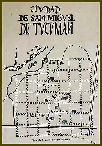 Como es sabido, la mencionada ciudad norteña fue trasladada el 24 de septiembre de 1685 desde su ubicación primigenia en Ibatín (desde entonces llamado sitio viejo o pueblo viejo) hasta un lugar distante doce leguas conocido como “La Toma”. Ese día culminó un conflictivo proceso iniciado por un grupo de vecinos aproximadamente en 1677, convalidado en diciembre de 1680, por una cédula real dictada por el Rey de España y que ordenaba el movimiento. El tema había dividido a la clase dirigente de la ciudad en dos bandos fuertemente contrapuestos: los que estaban a favor y los que se oponían a la transposición.[11]