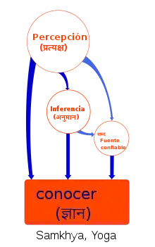 La escuela Yoga, como la escuela Samkhya, considera que la Pratyakṣa o Dṛṣṭam (percepción sensorial directa), Anumāna (inferencia) y Śabda o Āptavacana (testimonio verbal de los sabios o shāstras) son los únicos medios válidos de conocimiento o Pramana . [6] A diferencia de algunas otras escuelas de hinduismo como Advaita Vedanta, el Yoga no adoptó las siguientes tres Pramanas : Upamāṇa (comparación y analogía), Arthāpatti (postulación, derivada de las circunstancias) o Anupalabdi (no percepción, prueba negativa / cognitiva). [7]
