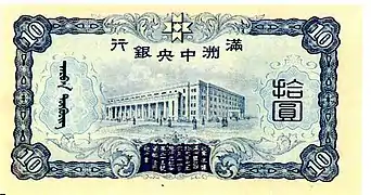 - Billete de 10 Yuan, 1937 (reverso), representando el edificio del Banco Central de Manchukuo.