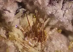 Hábito cristalino | raros cristales alargados, común granular masivo | |
