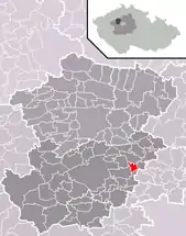 Se encuentra ubicada al noroeste de la región y de Praga, a poca distancia al norte del río Berounka —un afluente izquierdo del río Moldava—, y cerca de la frontera con la región de Ústí nad Labem.[1]