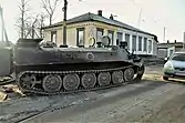 - (Un 4 negro sobre fondo blanco en hexágono rojo; hojas de roble blancas dobles): Estas marcas se han encontrado en vehículos de la 4.ª División de Tanques de la Guardia entre Sumy y Járkov, a veces juntas, a veces por separado. Las hojas dobles de roble blancas parecen haber sido la marca original de antes de la guerra, pero han sido reemplazadas o pintadas por encima con el 4 negro sobre fondo blanco en un hexágono rojo.[16]: 4:30