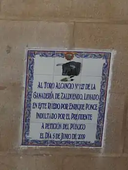 - Alcancio, n.º 127, negro, indultado por Enrique Ponce en Plasencia el 5 de junio de 2009. Desde febrero de 2010, un azulejo en el patio de cuadrillas de la plaza placentina recuerda el indulto del toro.[18][19][20]