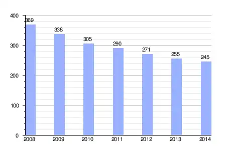 Gráfica de evolución de la deuda viva del ayuntamiento entre 2008 y 2014 |
