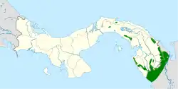 Se encuentra en los bosques húmedos tropicales de la región del Darién al oriente de Panamá y noroccidente de Colombia, entre los 90 y 1.600 m de altitud.[1]