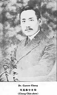 Zhang Junmai (en chino simplificado, 张君劢; Wade-Giles, ''Chang Chun-mai''; 1886–1969), también conocido por su nombre de cortesía Carsun Chang, fue un destacado filósofo y político socialdemócrata chino. Estudió en Japón con Liang Qichao, a quien acompañó en 1919 en su viaje a Europa donde conoció la socialdemocracia alemana.[1] Fundó el Partido Socialdemócrata Chino, pero tras el triunfo de la revolución comunista china en 1949 se marchó a Estados Unidos —y no a Taiwán pues también estaba en desacuerdo con el autoritarismo del Guomindang de Chiang Kai-shek—.
