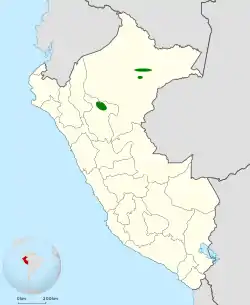 Se distribuye en dos regiones disjuntas en el norte del Perú: en el valle del río Mayo y a lo largo del adyacente río Huallaga (San Martín); y en la cuenca del río Nanay (Loreto).[3] Es incomún y muy local en la canopia de selvas pantanosas de suelo arenoso (varillal) hasta los 150 msnm de altitud.[4]