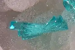 ![]() Zincolibethenita. Cristales de 1 mm sobre fluorapatito. Mina Tita, Vega de Tirados, Salamanca (España). Col. M.Calvo, foto J. Callén | ||