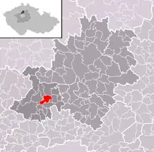 Se encuentra ubicada al norte de la región y de Praga, cerca de la confluencia de los ríos Elba y Moldava, y de la frontera con las regiones de Ústí nad Labem y Liberec.[1]