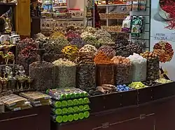 Las tiendas en el Zoco de las Especias ofrecen una variedad de fragancias y especias de incienso y shisha además de las muchas hierbas que se usan en la comida árabe y del sur de Asia. También se encuentran varios textitles, alfombras y objetos que se venden normalmente en el Zoco de las Especias.