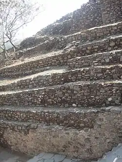 En la parte norte de este último recinto, se localizan unas escaleras fabricadas con grandes bloques de roca que llevan a un patio exterior rodeado por un muro. También se puede ver el sistema de drenaje con el que se contaba y el cual cuenta con una representación del dios Tláloc.