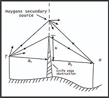 El efecto de filo de cuchillo o difracción de bordes se puede determinar con el principio de Huygens-Fresnel. En la propagación electromagnética se trata de un re-direccionamiento causado por la difracción de las ondas de radio al golpear sobre colinas, edificaciones u otro obstáculo cuyo ángulo es agudo. Aunque el cálculo de estas pérdidas en terrenos irregulares es un problema matemático complejo, se han realizado diferentes expresiones para las pérdidas de difracción en casos simples. Cuando la difracción es causada por un solo objeto, como una colina o edificación, la atenuación (perdida de potencia) causada por la difracción se puede estimar tratando la obstrucción como un filo de difracción. Este es el más simple de los modelos, y la pérdida de difracción en este caso se pueden estimar fácilmente utilizando la solución de Fresnel clásica para el campo detrás del filo de un cuchillo. La figura 3. ilustra este enfoque. [2]