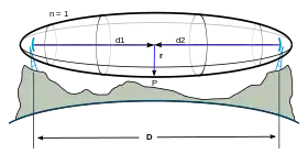 Para expresar esto de manera cuantitativa, se usa la teoría clásica de difracción y se reemplaza cualquier obstrucción a lo largo del camino por un plano absorbente colocado en la misma posición. El plano es normal al camino directo y se extiende hasta el infinito en todas las direcciones, excepto verticalmente, donde se detiene a la altura de la obstrucción original.[3] Esta expresión esta dada por: