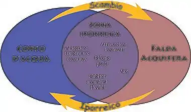 La dinámica de flujo y comportamiento en esta zona (denominada flujo hiporreico o bajoflujo) se reconoce como importante para interacciones de agua subterránea/ agua de superficie, así como desove de peces, entre otros procesos.[1] Como práctica innovadora de gestión del agua urbana, la zona hiporreia puede ser diseñada por ingenieros y activamente dirigidos para mejoras, tanto en calidad del agua, como en el hábitat ripícola.[2]