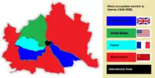 - Las tropas francesas, británicas, estadounidenses y soviéticas dividieron a Viena en cuatro zonas tras la Segunda Guerra Mundial, y una pequeña zona internacional del centro histórico de Viena fue gobernada en rotación por las tropas de esos países.