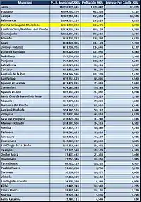 El P.I.B. (Producto Interno Bruto) representa todo el capital que el municipio produce en un año, mientras que el ingreso per cápita representa lo que en promedio percibe la población de esa localidad en un promedio al año, el valor se expresa en dólares estadounidenses.
