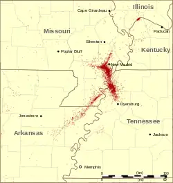 - 16 de diciembre de 1811, 0815 UTC (2:15 a.m.); (M ~7.5)[9] epicentro en el noreste de Arkansas, probablemente en la Falla de Cottonwood Grove;[10]: p. 7 causó solo leves daños en estructuras hechas por el hombre, debido a lo poco poblado del área del epicentro. La ubicación futura de Memphis, Tennessee fue afectada a una intensidad de un nivel de Mercalli nueve. Un seiche de origen sísmico se propagó río arriba y Little Prairie fue destruido por licuefacción de suelo.[11] Los solevantamientos locales del suelo y la vista de olas avanzando río arriba hicieron que los observadores se quedaran con a impresión de que el Río Misisipi estaba fluyendo al revés.[12]