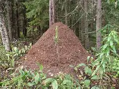 Las hormigas de madera (Formica paralugubris) a menudo incorporan grandes cantidades de resina de coníferas solidificada en sus nidos. Los estudios de laboratorio han demostrado que esta resina inhibe el crecimiento de bacterias y hongos en un contexto que imita las condiciones naturales.[46] Las hormigas muestran una fuerte preferencia por la resina sobre las ramitas y las piedras, que son materiales de construcción comúnmente disponibles en su entorno. Existe una variación estacional en la búsqueda de alimento de las hormigas: la preferencia por la resina sobre las ramitas es más pronunciada en primavera que en verano, mientras que en otoño las hormigas recolectan ramitas y resina a la misma velocidad. La tasa relativa de recolección de resina versus cálculos no depende de la infección con el hongo entomopatógeno Metarhizium anisopliae en condiciones de laboratorio, lo que indica que la recolección de resina es profiláctica más que terapéutica.[47]